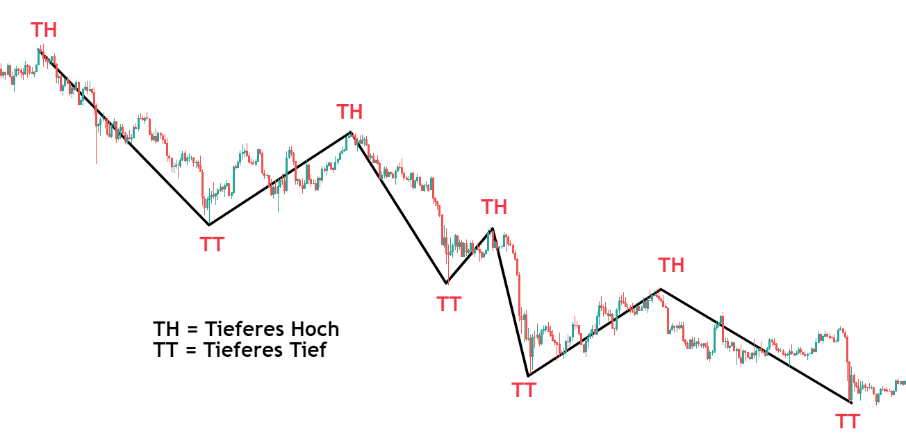 Abwärtstrend sind das Gegenstück zum Aufwärtstrend und werden durch tiefere Hochs (TH) und tiefere Tiefs (TT) definiert. Entfernt sich ein Kurs mehr als 20% von seinen Allzeithochs, dann wird der Begriff „Bärenmarkt“ geprägt. Dies ist eine lange Marktphase wo Verkäufer dominieren und sich Kurse in längeren Abwärtstrends befinden.