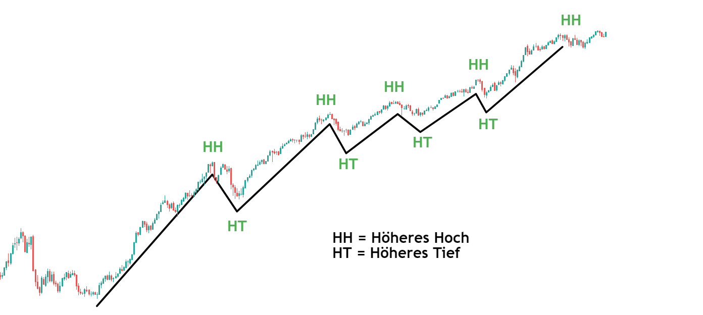 Ein Aufwärtstrend wird durch eine Folge von höheren Hochs (HH) und höheren Tiefs (HT) definiert. In großen Zeiteinheiten geht diese Marktphase oftmals mit Allzeithochs einher und wird mit dem Begriff „Bullenmarkt“ verbunden. Die Hochs und Tiefs laufen dabei wie eine Treppe immer weiter hoch. Es gibt hier also eine langfristige Wertsteigerung des Assets.