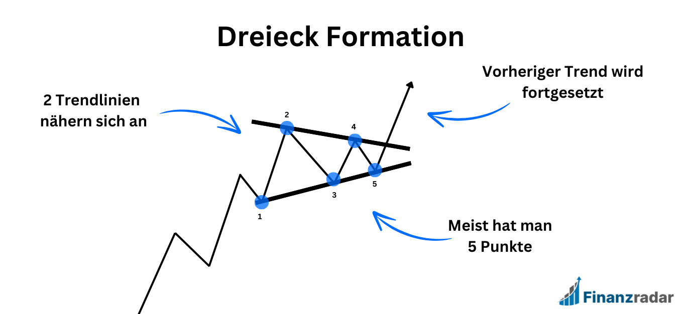 Ein Dreieck besteht aus 2 konvergierenden Trendlinien und ist eine besondere Form der Konsolidierung. Die Dreieck-Formation gilt als Fortsetzungsmuster, wobei es egal ist, ob die Formation in einem Auf- oder Abwärtstrend vorkommt.