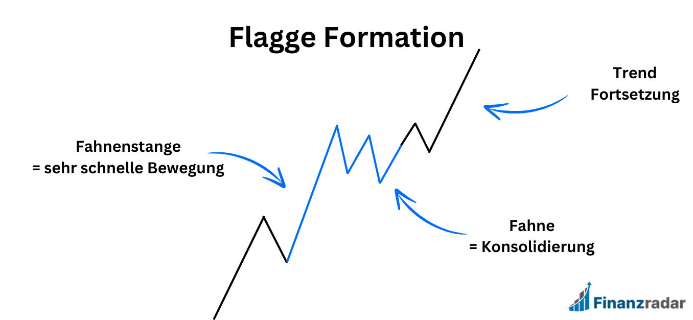Eine Flagge besteht aus einer Fahnenstange sowie einer Fahne. Die Fahnenstange ist eine impulsive Bewegung, sprich es gibt einen starken Trendschub, wohingegen die Fahne eine Konsolidierung darstellt. Die Flagge ist die stärkste Formation für Trendfortsetzungen, da sie die Struktur eines Trends (höheres Hoch und höheres Tief) beinhaltet.