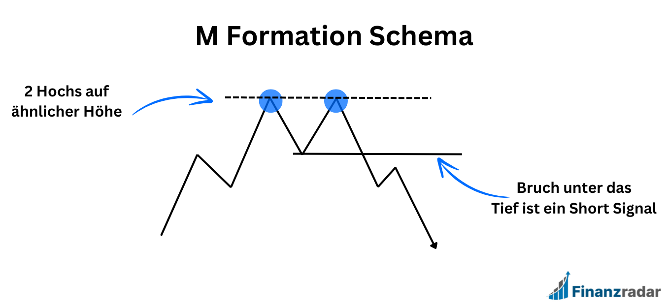 Das M Pattern (auch als Doppeltop bekannt) besteht aus 2 Hochs, welche auf einem ähnlichen Level liegen. Du kannst Dir hier ganz gut einen Widerstand vorstellen. Bricht der Kurs unter das Zwischentief, so gitl dies als Umkehrsignal.