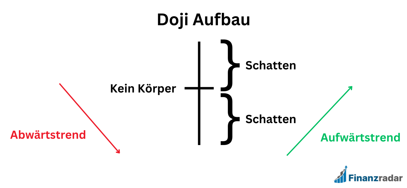 Der Doji ist durch den extrem kleinen (oder bestenfalls gar keinen) Kerzenkörper definiert. Der Eröffnungs- und Schlusskurs liegen somit auf ähnlichem Level. Einen Doji interpretiere ich als Unentschlossenheit im Markt, da sich weder Käufer noch Verkäufer als dominant durchsetzen konnten. Die langen Schatten deuten allerdings an, dass Käufer und Verkäufer aktiv sind. Meist warte ich ab bis das Hoch/Tief der Dojikerze gebrochen wird, um einen Trendwechsel zu bestätigen.