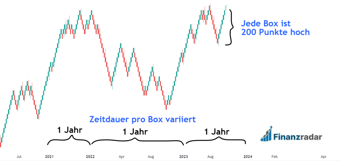 Der Begriff „Renko“ stammt vom japanischen „Renga“, was für Ziegelstein steht, ab. Der Chart fokussiert sich einzig allein auf Preisdifferenzen, während er die Zeitdauer einer Bewegung ignoriert. So wird bspw. ein Block im Chart nicht wie beim Kerzenchart nach bspw. 1 Stunde geplottet, sondern wenn der Kurs eine Mindestbewegung von X Euro gemacht hat. Im DAX Chart könnte ich bspw. 200 Punkte als Block-Größe einstellen, dann sieht er so aus: