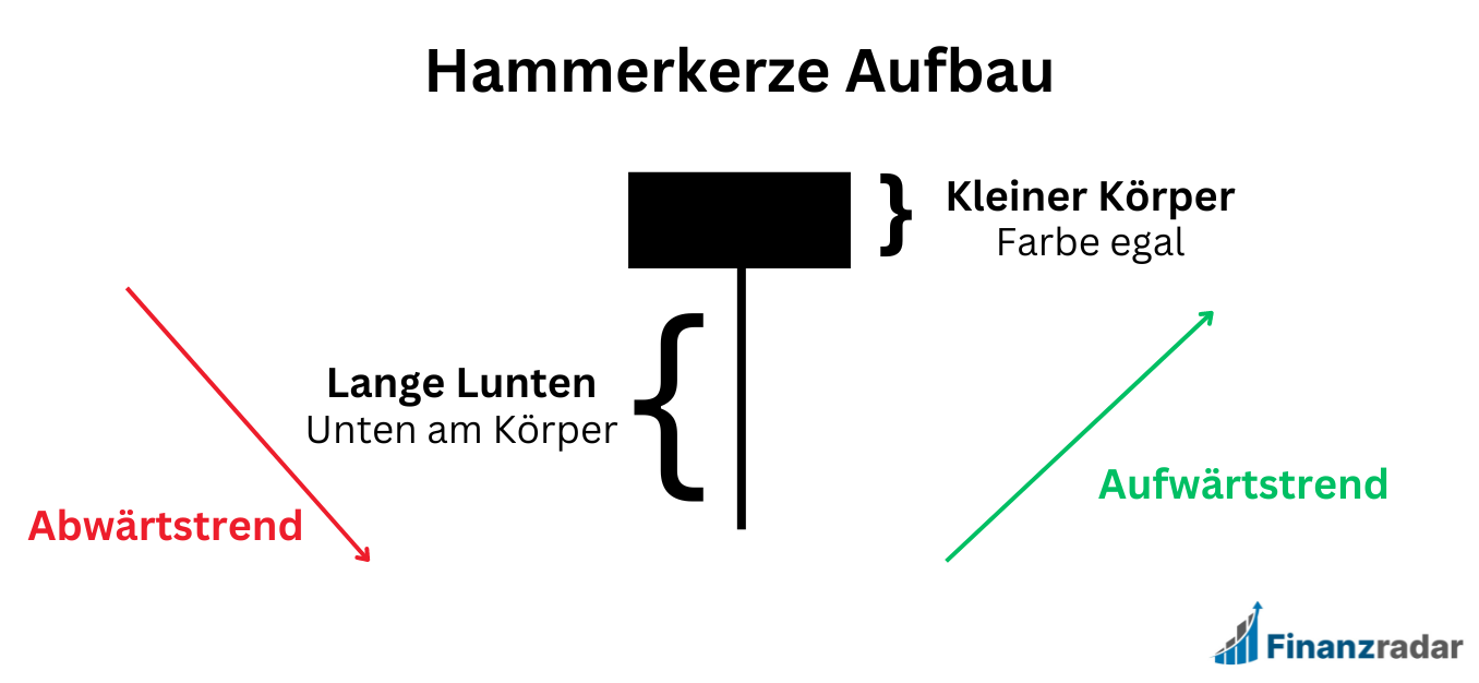 Die Hammerformation besteht aus einer einzelnen Hammerkerze. Diese Kerzenart ist durch ihren kleinen Körper und großen Schatten charakterisiert. Die lange Lunte entsteht dadurch, dass der Kurs erst abverkauft, aber innerhalb der Zeiteinheit wieder aggressiv hochgekauft wird. Die Lunte deutet damit eine möglich Umkehr von abwärts in aufwärts an.