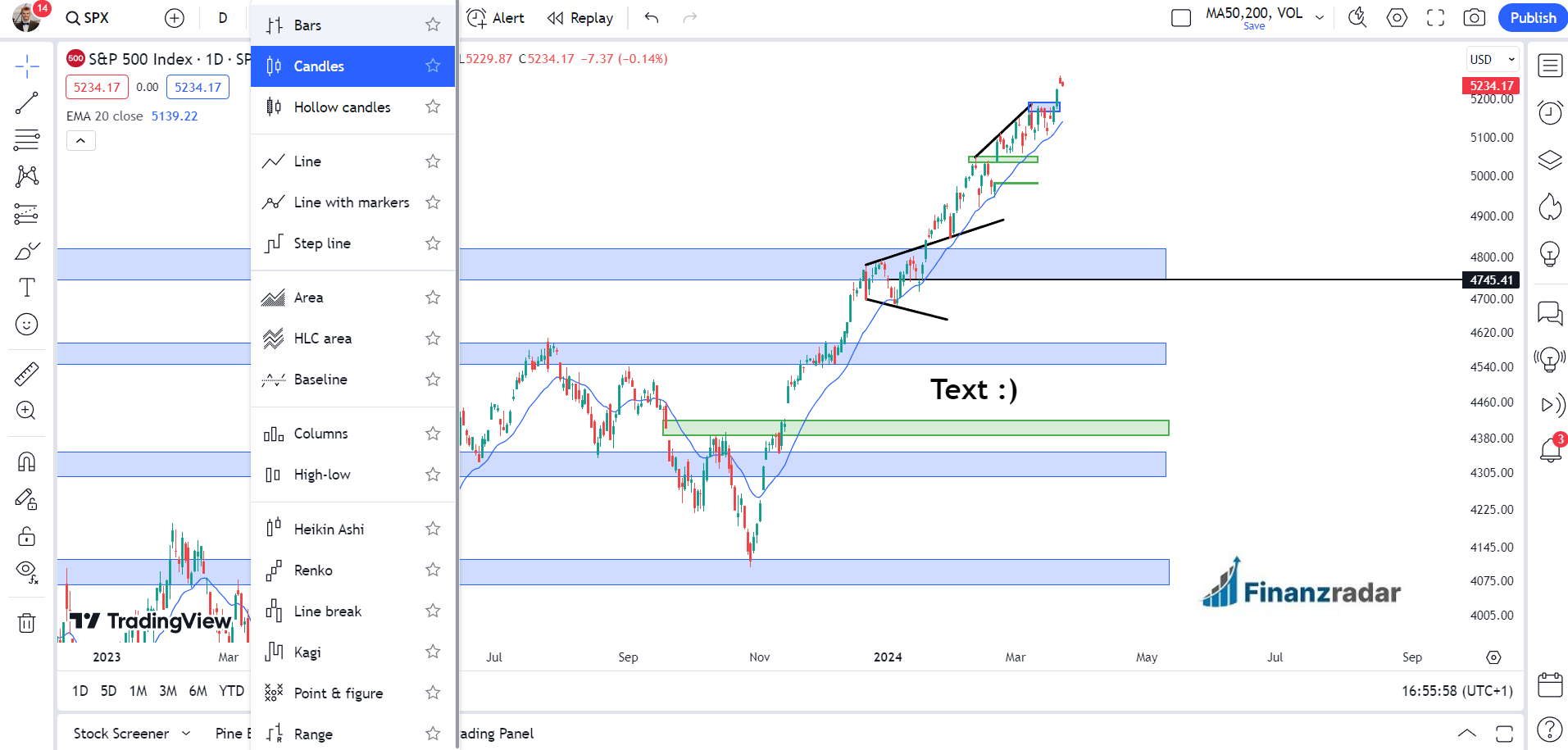 Tradingview ist die bekannteste Chartsoftware der Welt. Das Tradingview „Supercharts“ Tool ist kostenlos verfügbar – Du brauchst lediglich einen Tradingview Account. Hier hast Du eine große Auswahl an Chartarten, Tools und Indikatoren. Du kannst auch eigene Indikatoren programmieren und im Chart einspielen. Ebenso wertvoll finde ich den Replay-Modus wo Du den Chart zurück spulen kannst Du Kerze für Kerze aufdecken kannst. Versuch hier mal Kursbewegungen zu prognostizieren.