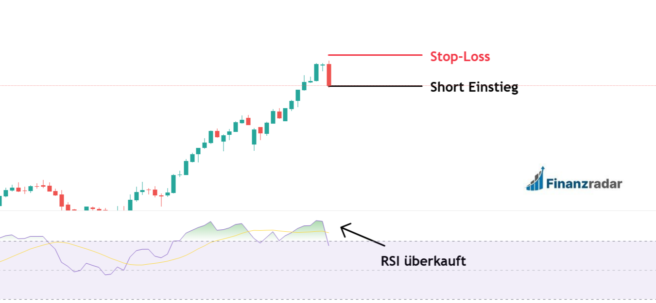 Die umgekehrte Logik des Long Tradings aus dem ersten Beispiel kann ich auch für Short Trading anwenden. Läuft der RSI-Wert über 70, so habe ich die Erwartung, dass es zeitnah zu einer Gegenbewegung für Short kommen kann. Die Price Action soll mir hier als finales Signal dienen. Im Beispiel kannst Du einen Evening Star sehen. Auch hier kannst Du beobachten wie der RSI schon lange über 70 ist und der Kurs dennoch weiter steigt.