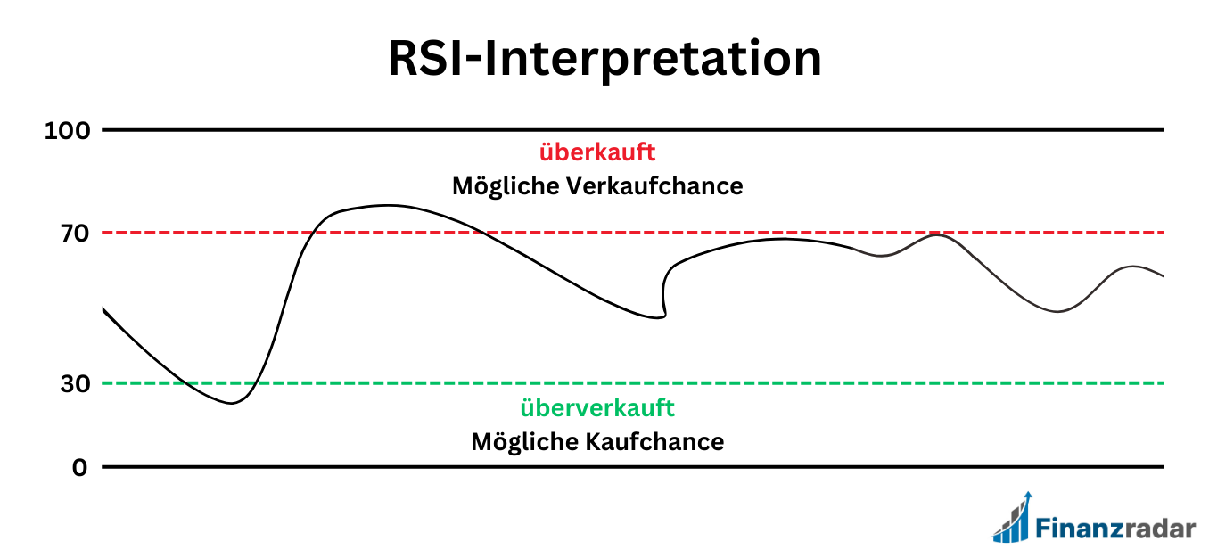 Ist der RSI-Wert über 70, so ist der Kurs kurzfristig sehr schnell gestiegen. In diesem Fall ist die Chance hoch, dass die Aktie einen Rücksetzer macht. Aus diesem Grund wird der Bereich auch als „überkauft“ bezeichnet und bietet eine Verkaufsmöglichkeit. Befindet sich der RSI-Wert hingegen unter 30, so ist das Wertpapier kurzfristig sehr stark gefallen. Der Kurs ist „überverkauft“ und könnte zu einem Rebound ansetzen.