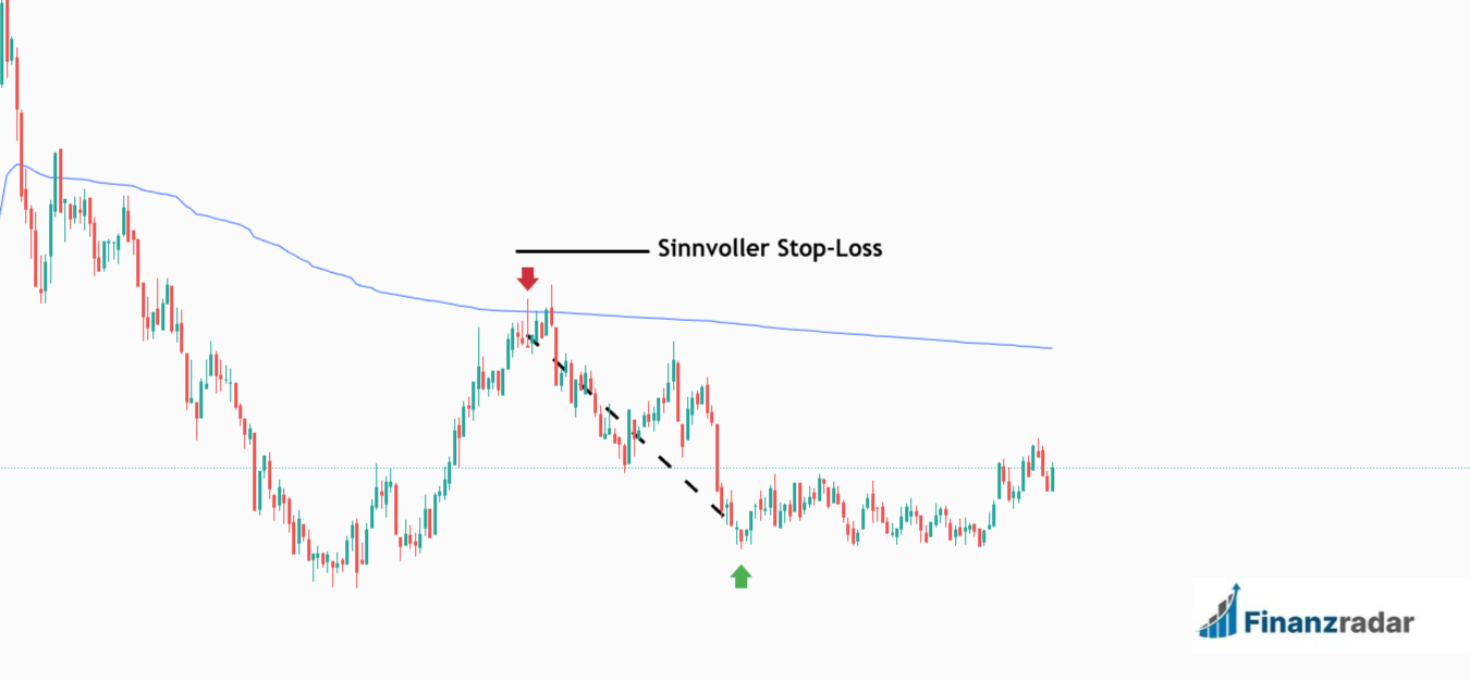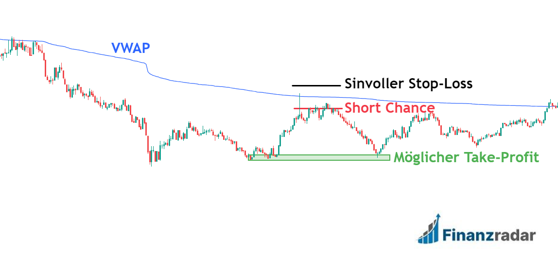 Befindet sich der Kurs über einen längeren Zeitraum unter dem VWAP, so ist das Wertpapier im Abwärtstrend. Da ich ein große Fan von Trend Trading bin, möchte ich in dem Fall auf Short Suche gehen. Der VWAP als dynamischer Widerstand könnte genau hier seine Wirkung zeigen. Testet der Kurs den VWAP von unten an und bildet Abweisungskerzen (bspw. Shooting Star Formation), so gehe ich Short in den Markt mit einem sinnvollen Stop-Loss knapp über dem Hoch.
