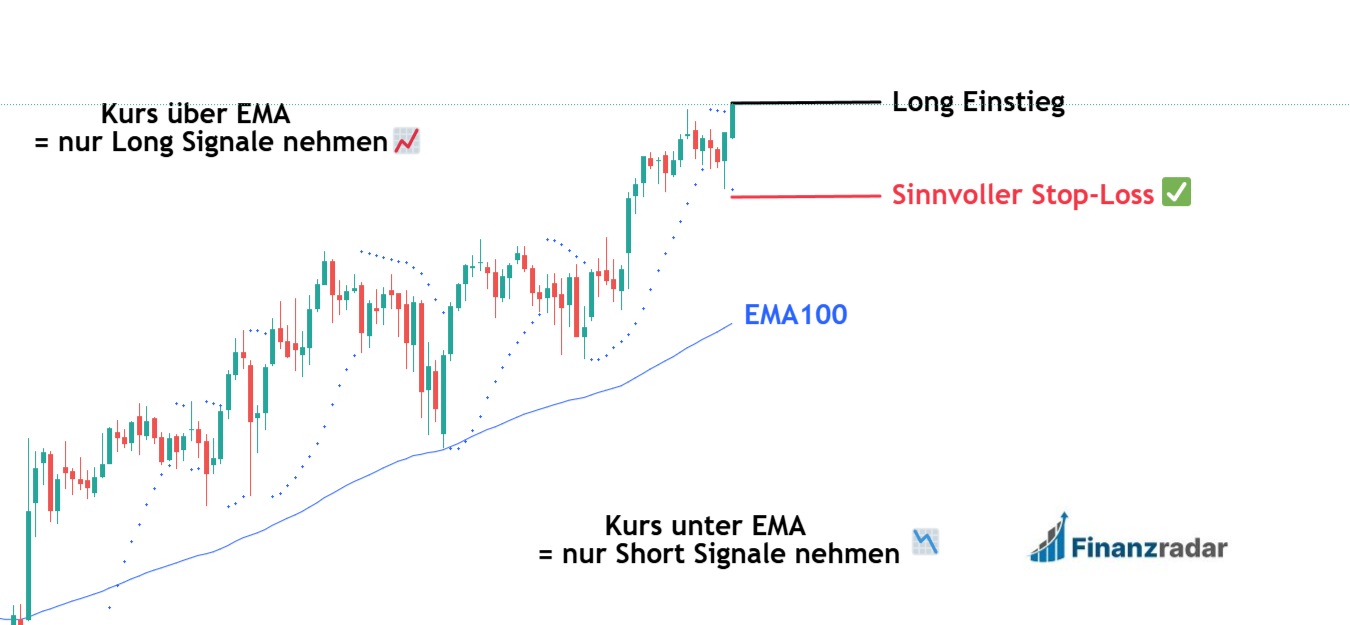 Die Idee der Kombination von Indikatoren wo einer für den Trendfilter und einer für die Signale zuständig ist, lässt sich auch mit anderen Kombinationen realisieren. Ein EMA100 als Trendfilter sowie dem Parabolic Stop and Reverse (Parabolic SAR) ist ebenfalls eine gute Möglichkeit als Strategie Grundlage. Beide Indikatoren gewichten neue Kurse deutlich mehr in ihrer Berechnung als ältere Daten, weswegen sie für kurzfristige Trade interessant sind.