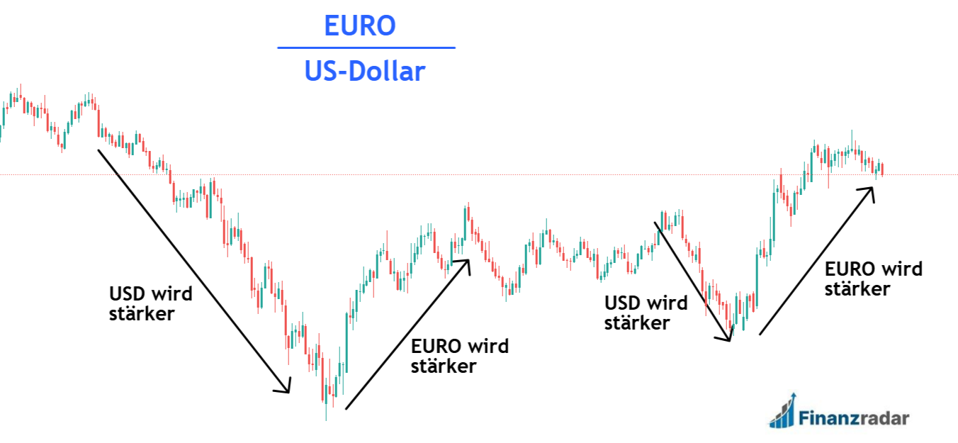 Steht der EUR/USD Kurs bei 1,20 so bedeutet dies, dass 1 Euro in 1,20 Dollar umgetauscht werden kann. Steigt der EUR/USD Kurs auf bspw. 1,50, so beudetet dies, dass der Euro an Wert gewonnen hat gegenüber dem US-Dollar. Um zu wissen, welche Währung gerade stärker wird, kannst Du Dir das wie ein „Tau ziehen“ vorstellen: Geht der Kurs hoch, gewinnt der Euro; geht der Kurs runter, so zieht der USD stärker. Schau mal hier: