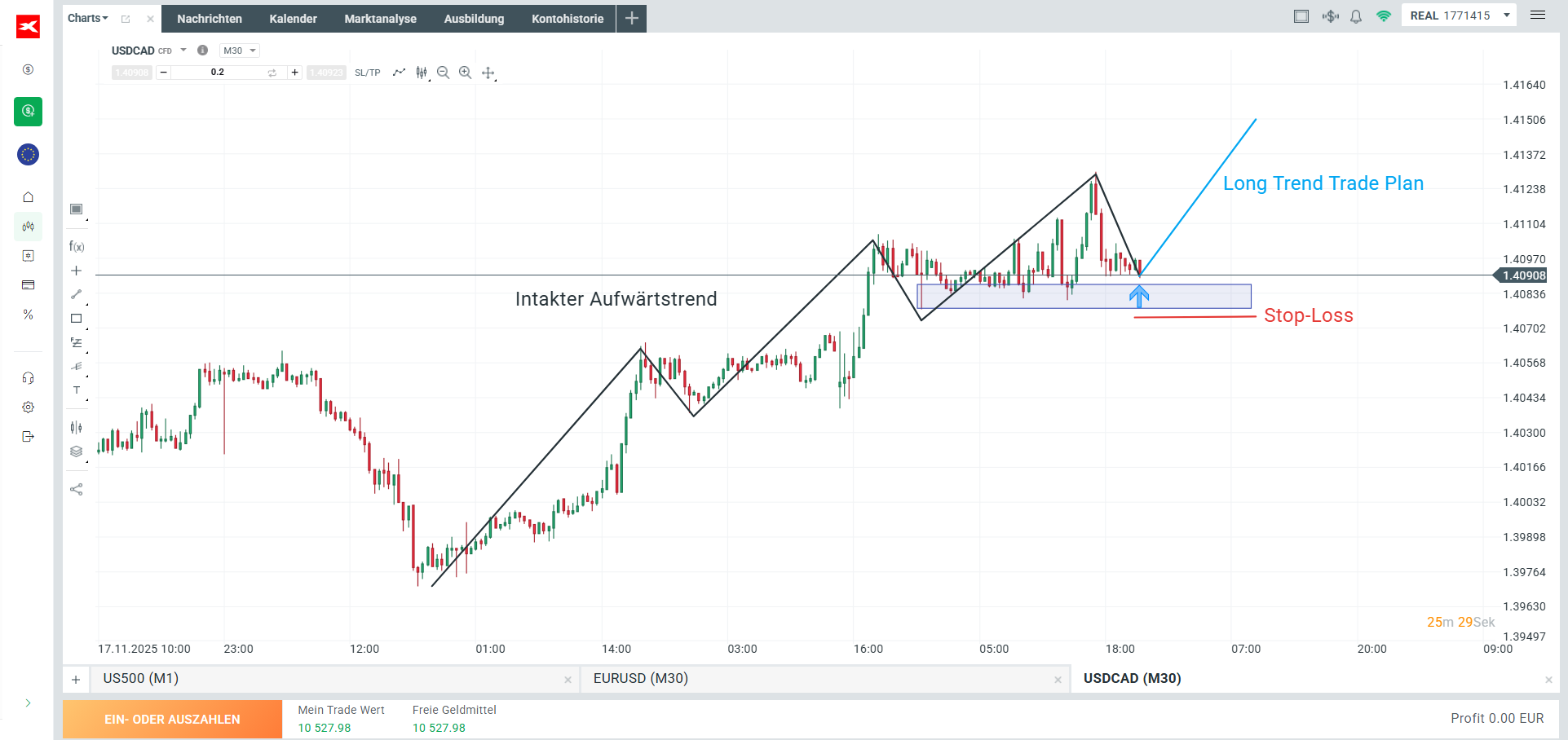 Beachte: In meinem Trading setze ich immer einen Stop-Loss. Diesen platziere ich knapp unter dem EMA50 bei einem Long Trade. Je nach Stop-Entfernung passe ich meine Positionsgröße so an, dass ich maximal 0,4% meine Depots verlieren kann.