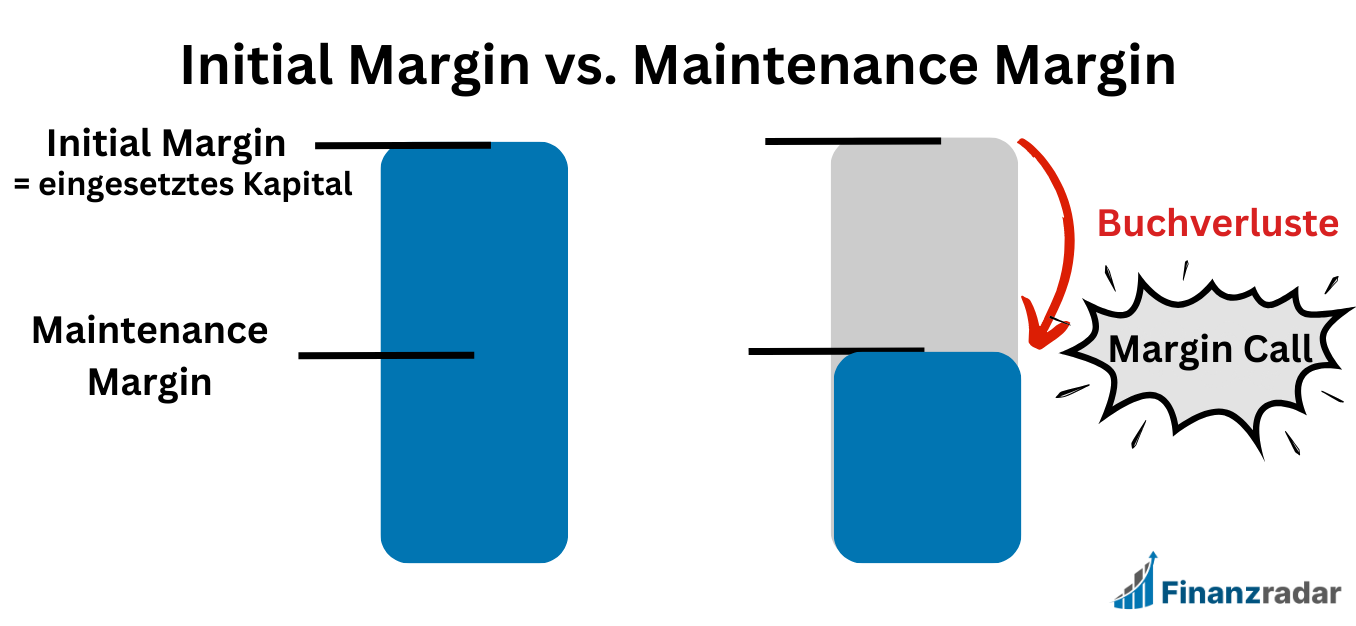 Wenn Du eine Position eröffnest, dann setzt Du eine „Initial Margin“ (Sicherheitsleistung) ein. Der Trade kann solange geöffnet bleiben wie die „Maintenance Margin“ (Haltemargin) nicht unterschritten wird – ansonsten kommt es zum Margin Call. Die Höhe der Maintenance Margin hängt von Deiner Depotgröße und Deinem Broker ab. Typischerweise wird bei CFD-Brokern eine Grenze von 50% des Depotwertes gesetzt (siehe folgende Grafik).